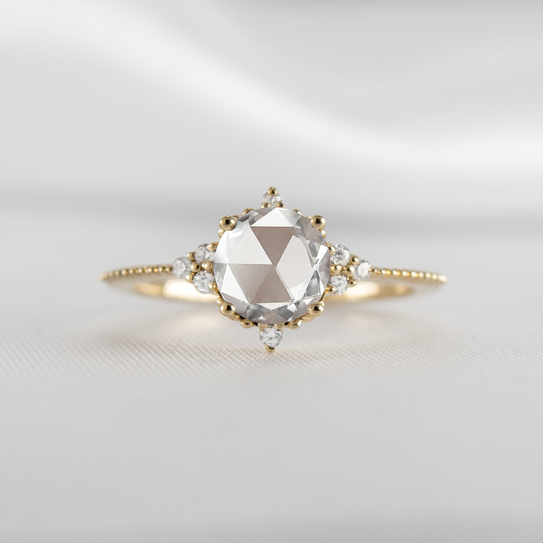 The Galaxy Rose Cut Diamond engagement ring is a celestial beauty, with a rose cut diamond design evoking the glitter of stars in the night sky.