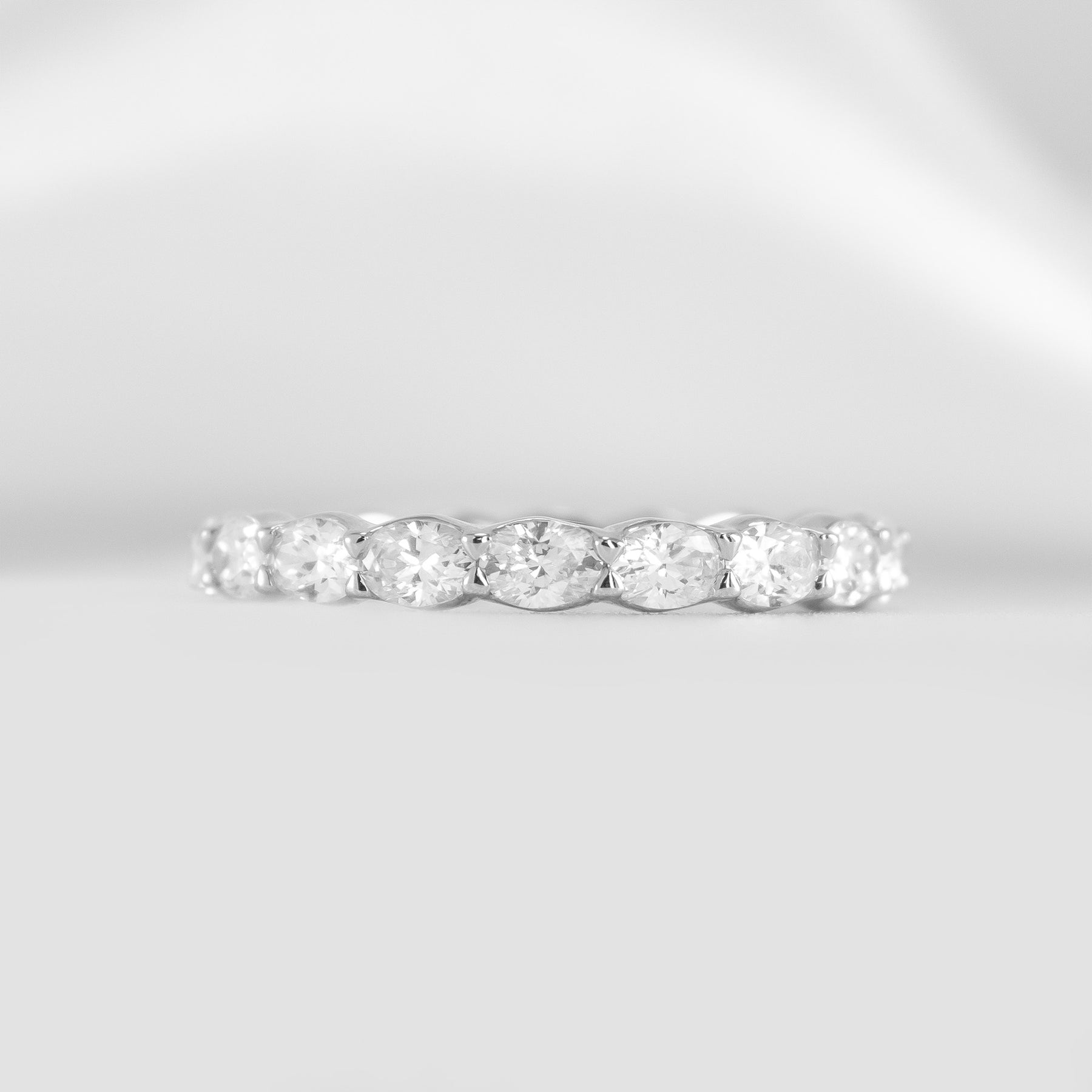 A modern classic with a twist—The Emerson East West Oval Diamond Wedding Ring is a refined expression of timeless love and individuality. This contemporary design reimagines tradition by setting each oval diamond horizontally, creating a diamond eternity band that feels fresh, elegant, and quietly bold.