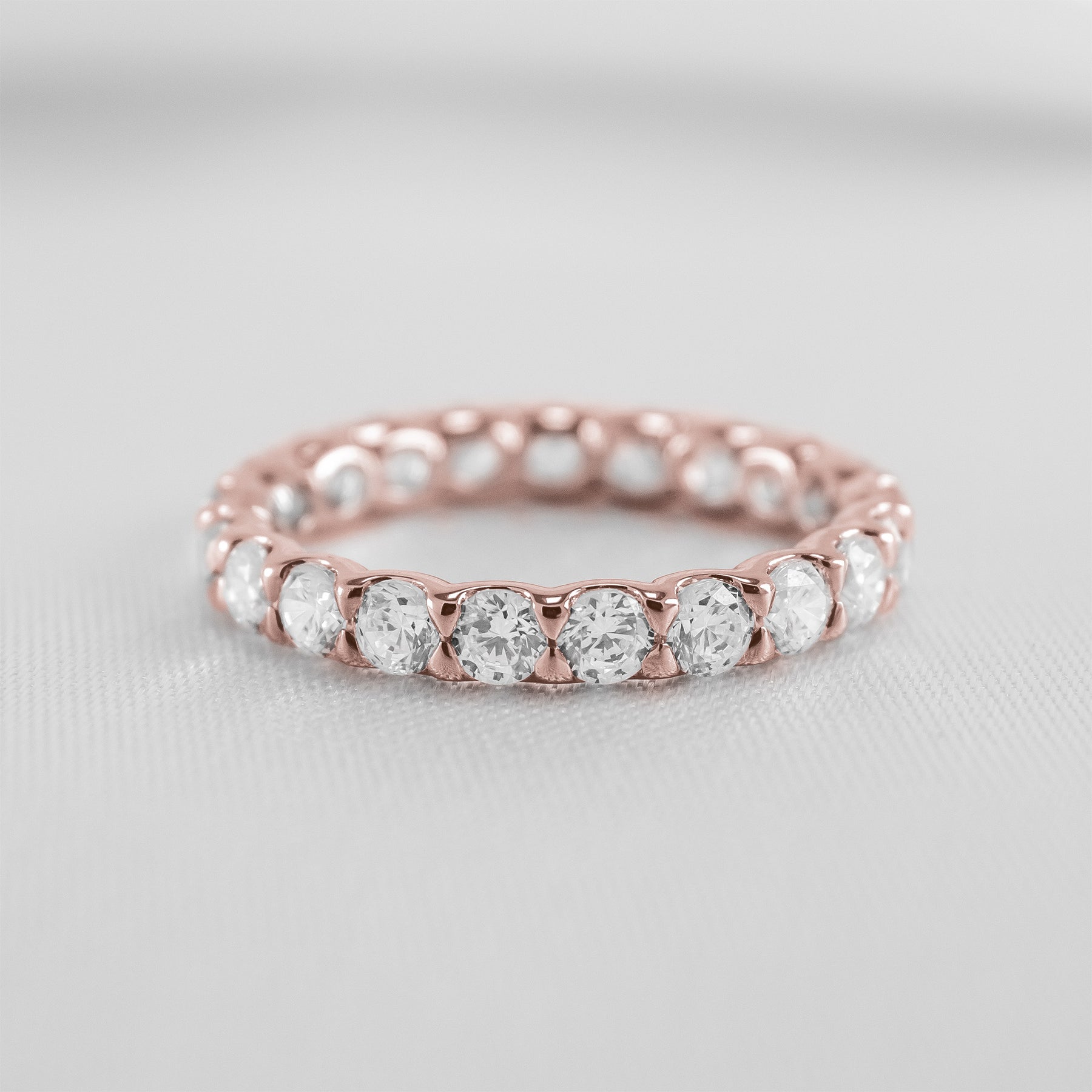 This diamond eternity band features a full circle of round brilliant diamonds, each prong-set to capture and reflect light in every direction. The seamless design symbolizes an everlasting bond — a round diamond wedding ring that glows with quiet sophistication and timeless beauty.