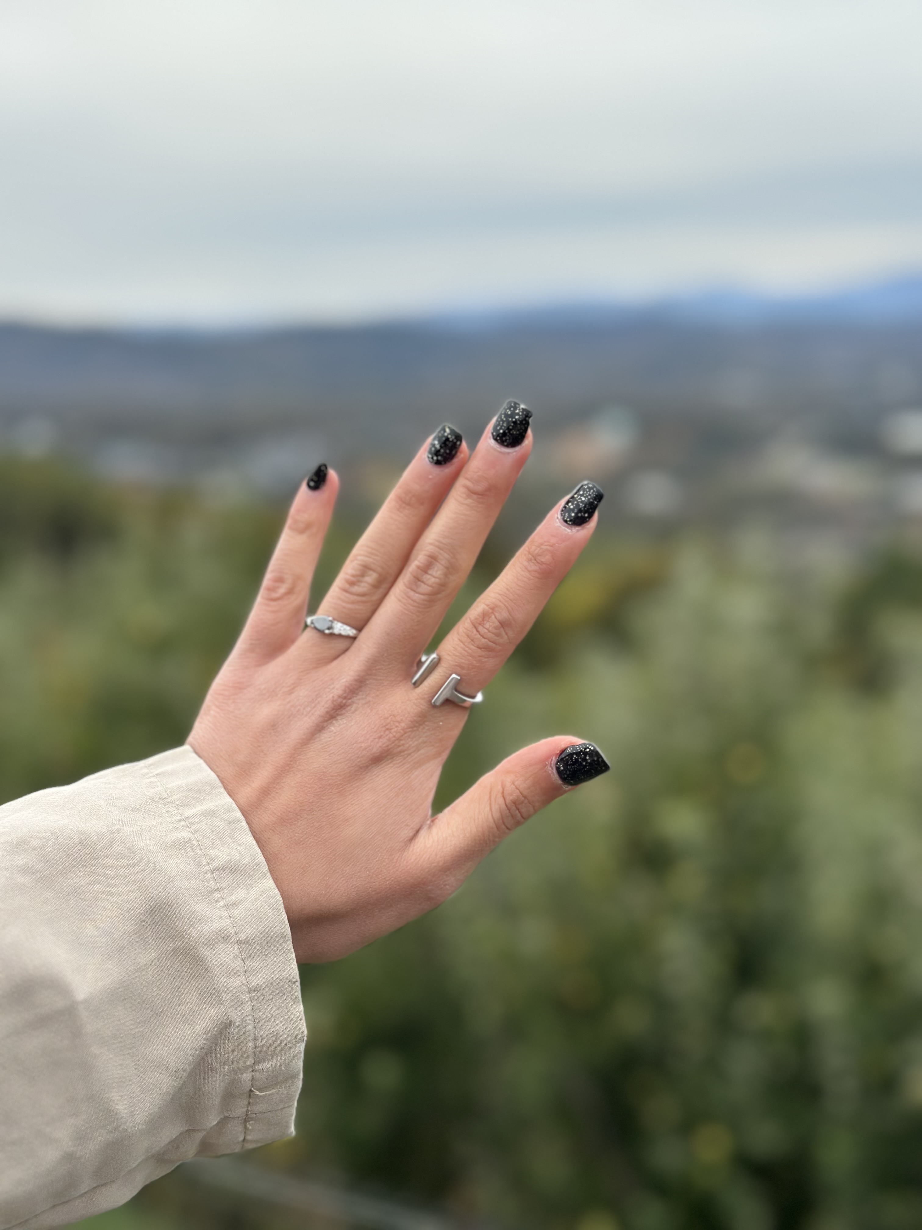 The Peyton ring has a stunning and bold design that radiates sophistication. It showcases a pear-shaped diamond with salt and pepper hues, set in an east-west direction, and enhanced with five round brilliant white diamonds for extra shine. Its asymmetrical arrangement adds to its charm and seamlessly blends classic and contemporary styles.